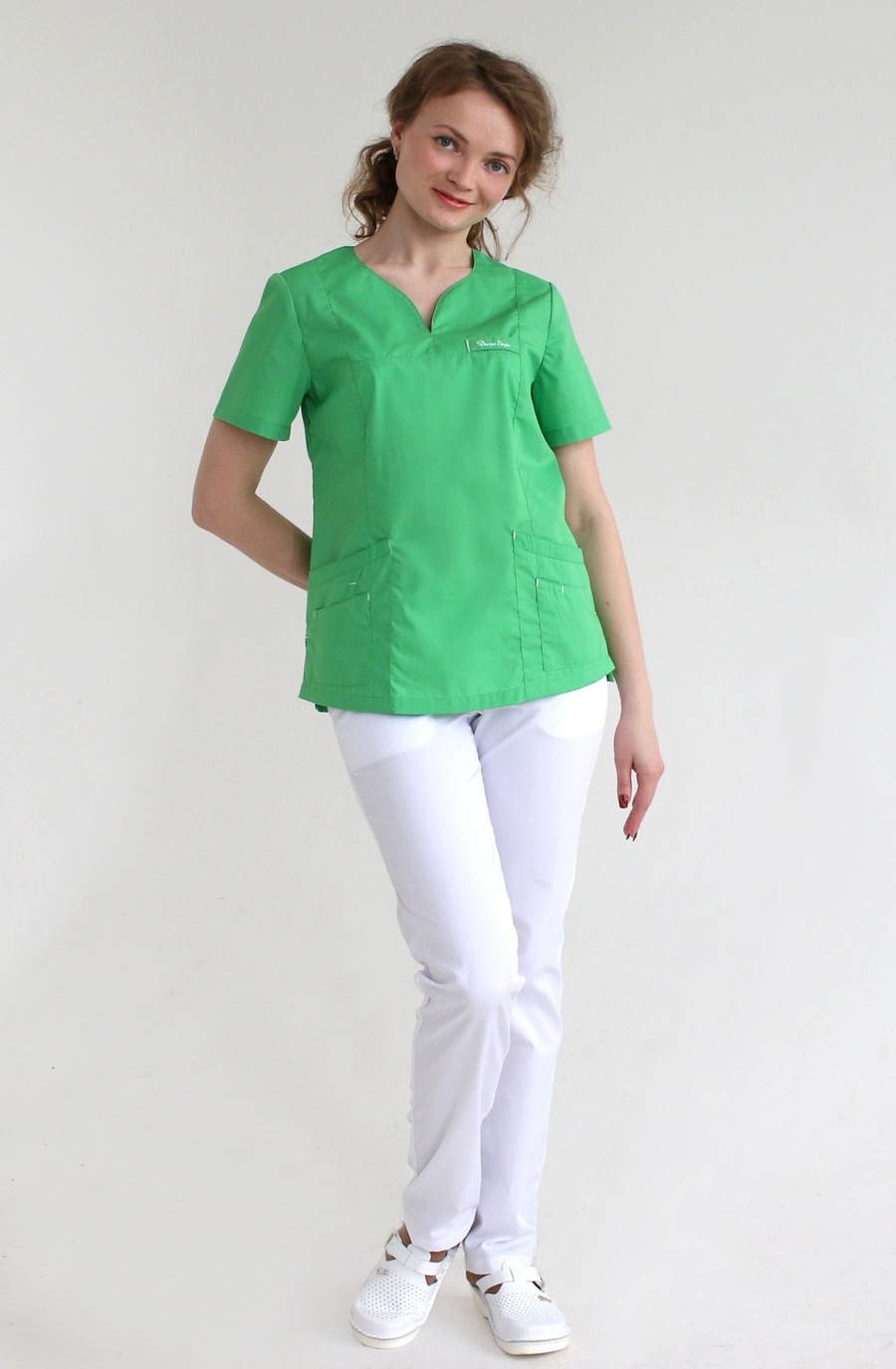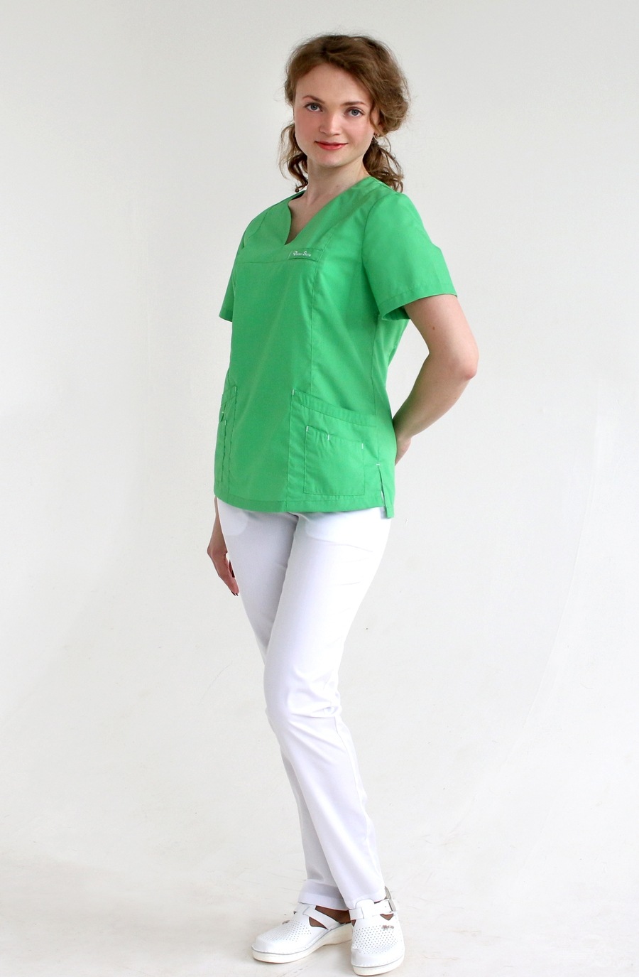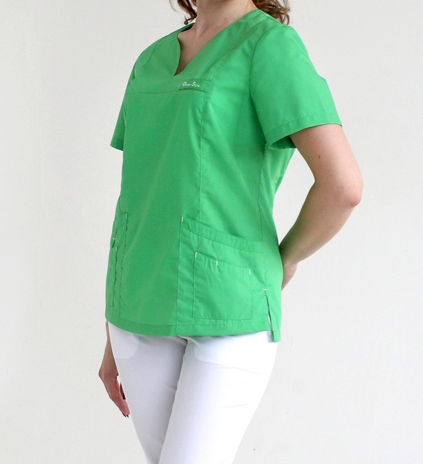 «Хирургическая» женская медицинская модель без застежек, с короткими рукавами и разрезами по бокам.