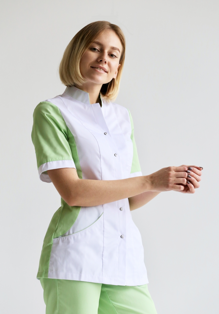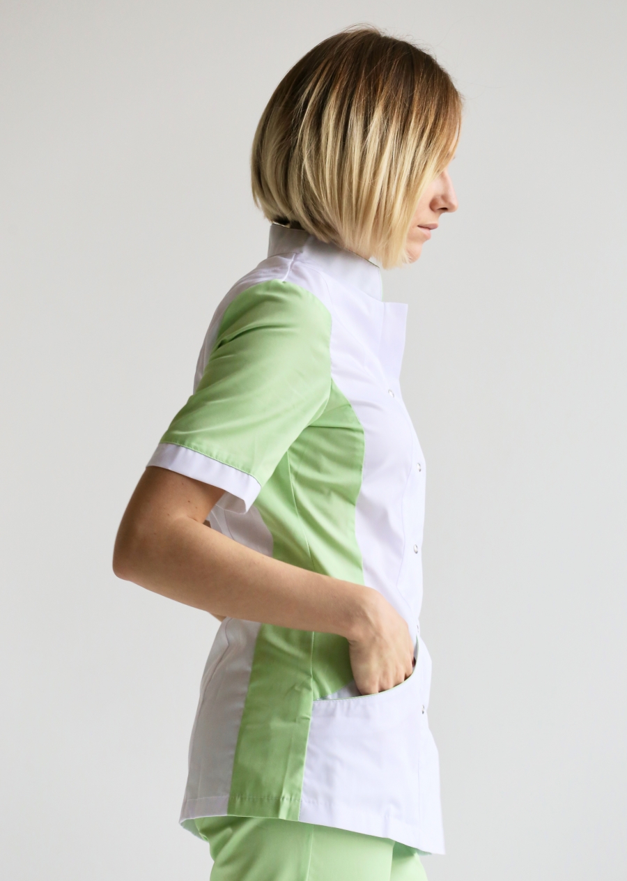 Блуза "Панацея" - элегантная и удобная. Великолепное сочетание цветов прибавит Вам настроение в течение рабочего дня. Приталенный силуэт подчеркнет достоинства Вашей фигуры. Верхние и нижние карманы подойдут для инструментов или личных вещей. Двухцветный воротник - стойка или отложной по Вашему вкусу. Размеры: с 40 по 52