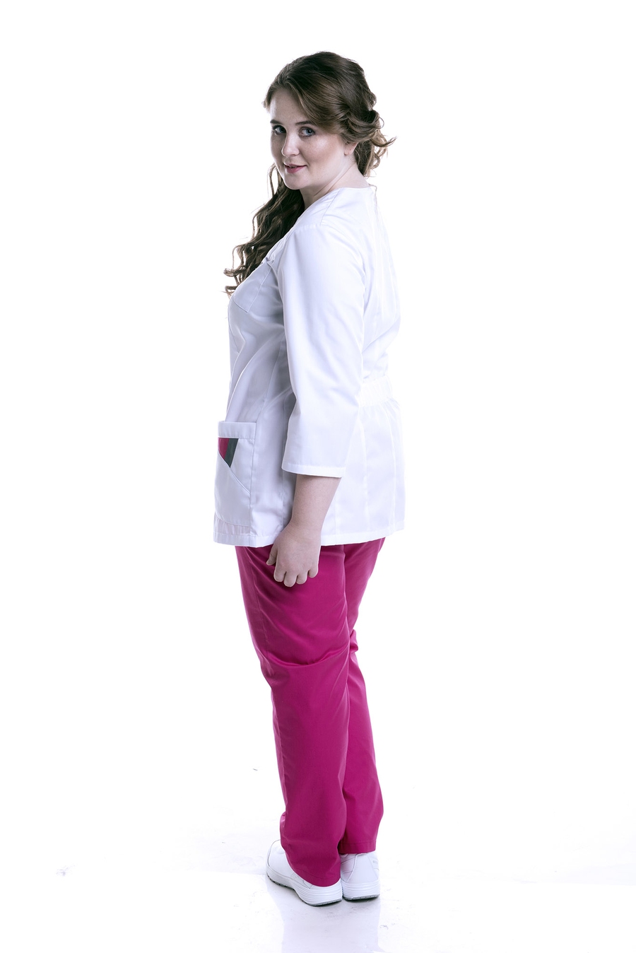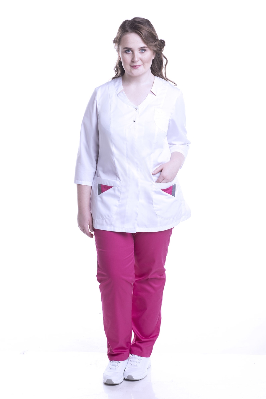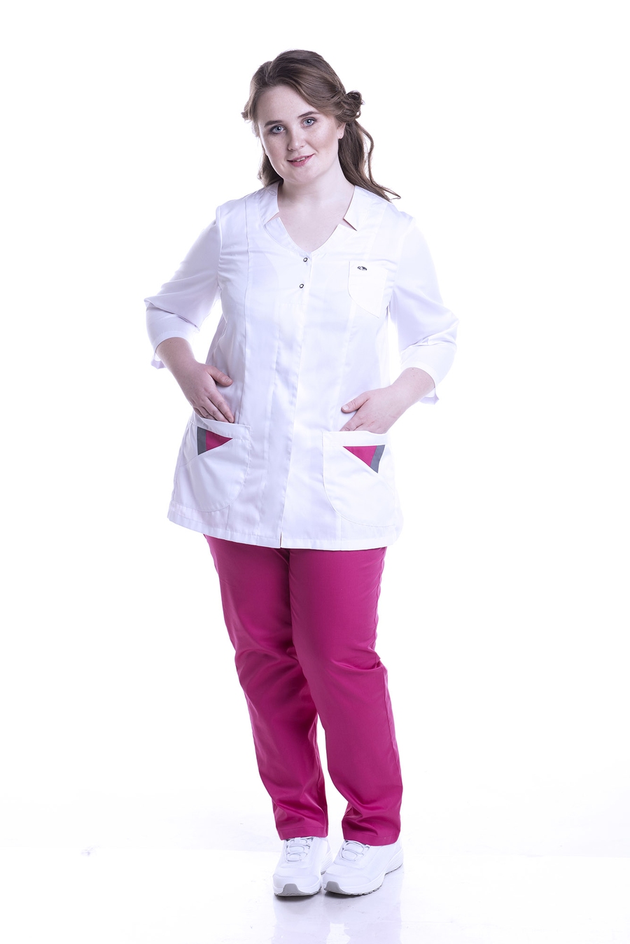 Особенность этой женской блузы - оригинальный воротник с закругленной горловиной. Это настоящий подарок для тех, кто любит комфортное облегание и нужно одеть сотрудников в изделие с большой градацией по размерам. Пояс на резинке сзади, скрытая застежка сверху донизу и объем под большую грудь делают эту блузу особенно комфортной для повседневной работы. Также несомненное достоинство модели - большие размеры. В этой блузе Вы всегда будете выглядеть элегантно и стильно! Комбинируется белыми или серыми брюками.