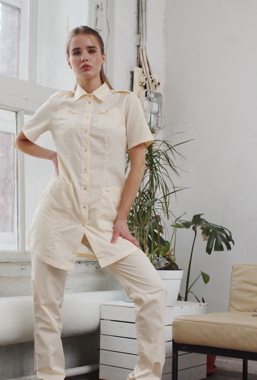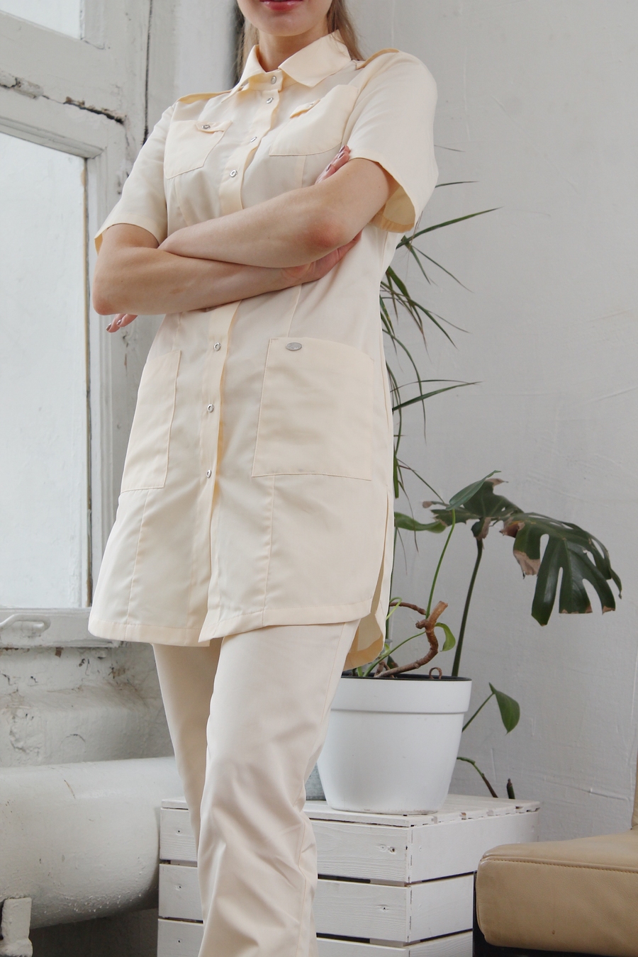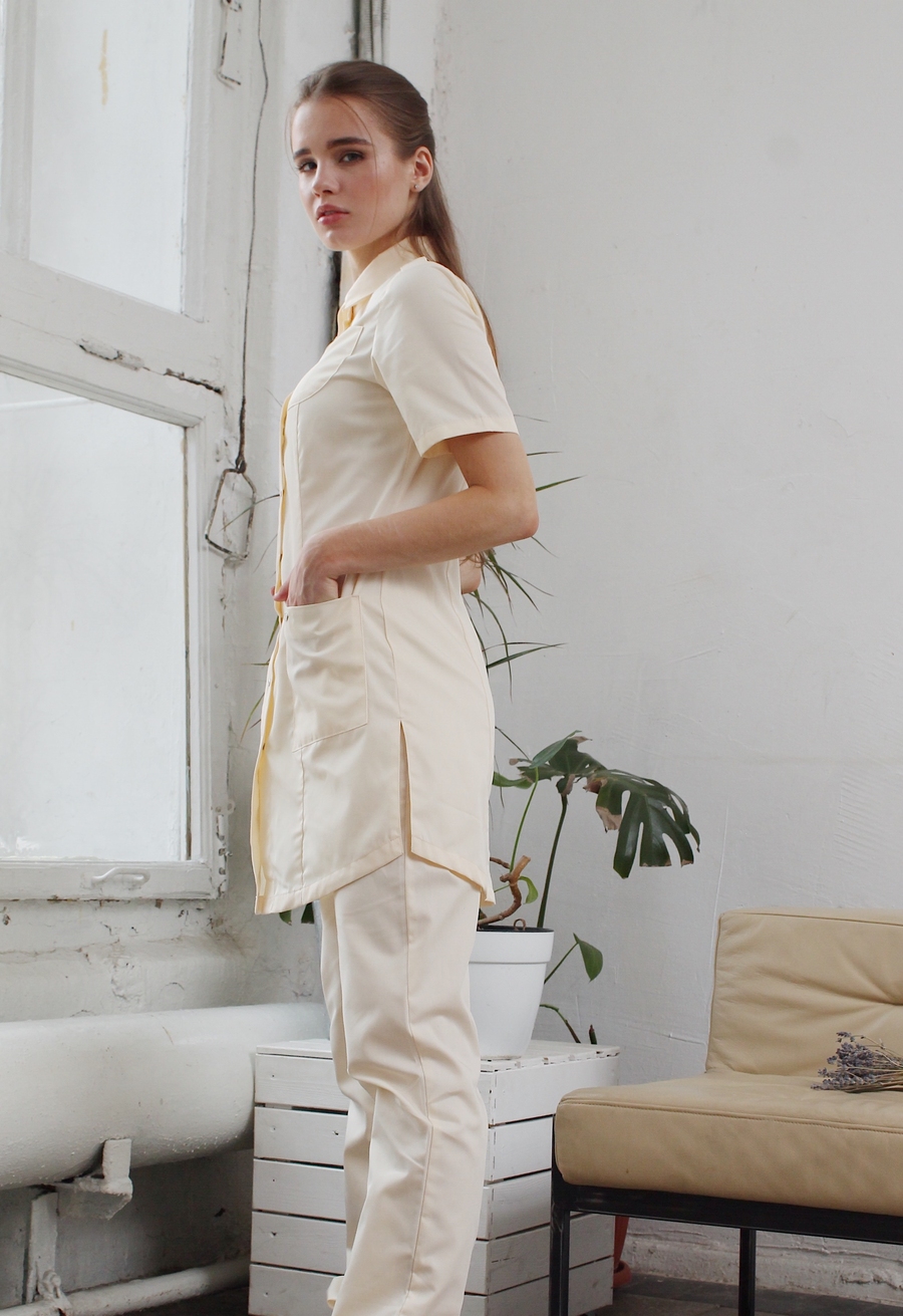 Эта удлиненная блуза - универсальная одежда для каждого медицинского работника. Кремовый тон выглядит благородно и спокойно. Отложной воротник, глубокие боковые и нагрудные карманы делают блузу "Сафари" невероятно удобной и практичной. Паты, декоративные погоны, фигурный край с боковыми разрезами выделяют эту модель среди прочих. Она превосходно сочетается с брюками кремового цвета и другими брюками. Выбирайте ТМ "Доктор Стиль" и будьте стильными! Размеры: с 40 по 62