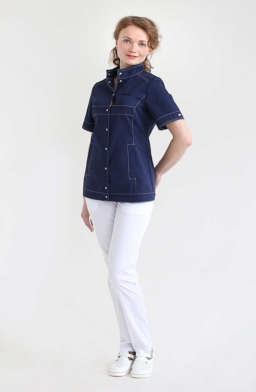 Очень эффектная блуза сложной конструкции. Укороченная модель с коротким рукавом и воротником-стойкой. Темно-синяя ткань контрастирует со светлой строчкой по швам. Крой на основе немецких лекал обеспечивает хорошую посадку по фигуре. Два боковых прорезных кармана вместят необходимые в работе мелочи. Рекомендуемые размеры: 40-52