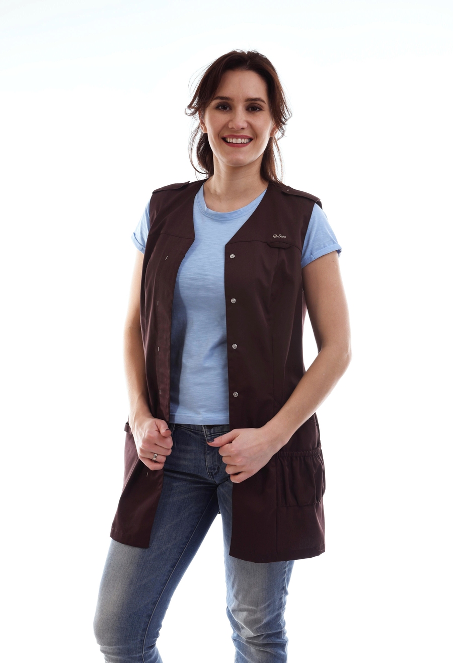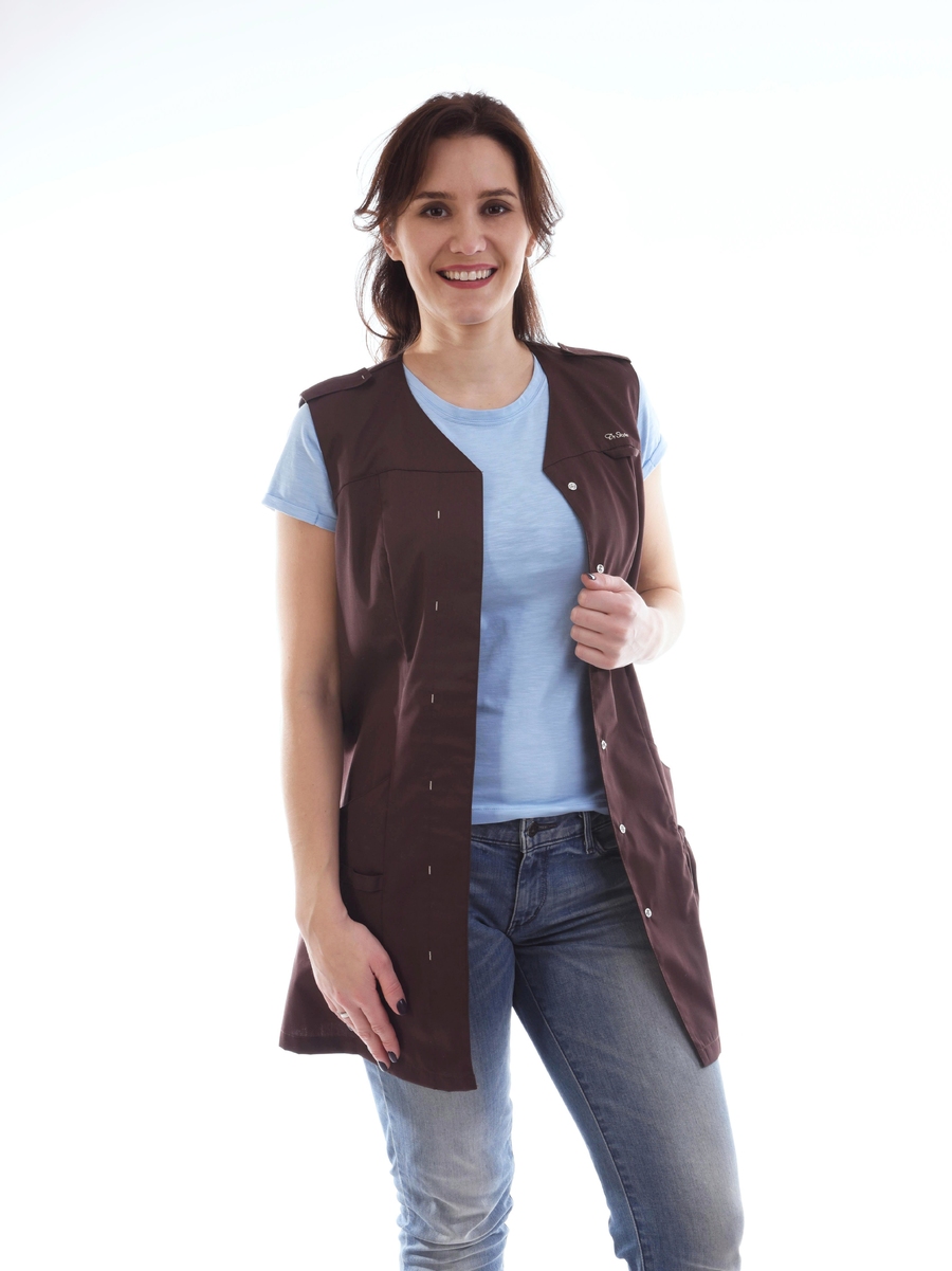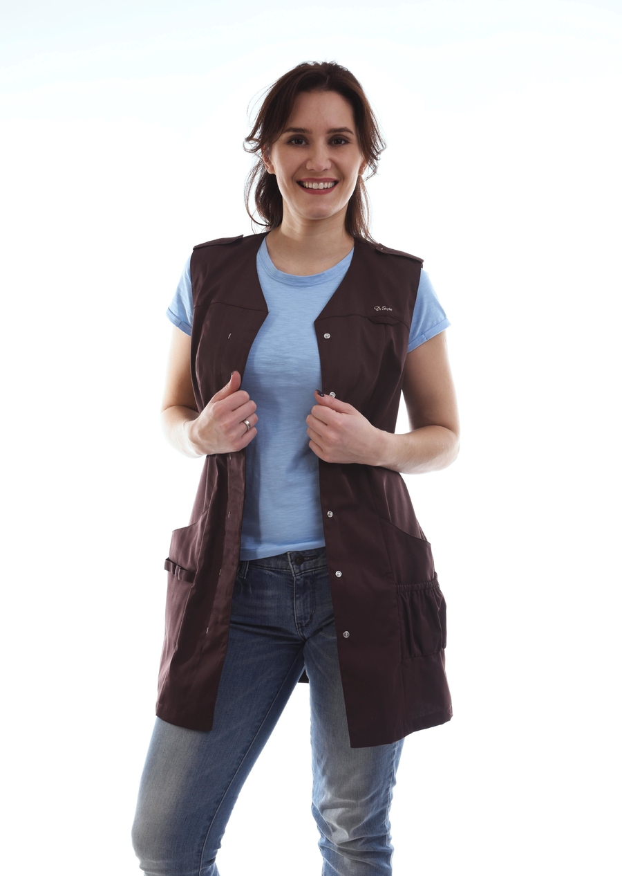 Эта блуза особо любима парикмахерами, визажистами, специалистами ногтевого сервиса и другими работниками сферы красоты. Стильно сочетается с обычными джинсами, футболкой и кедами. Можно носить как жилет. Бывает в двух расцветках: черная и шоколад.