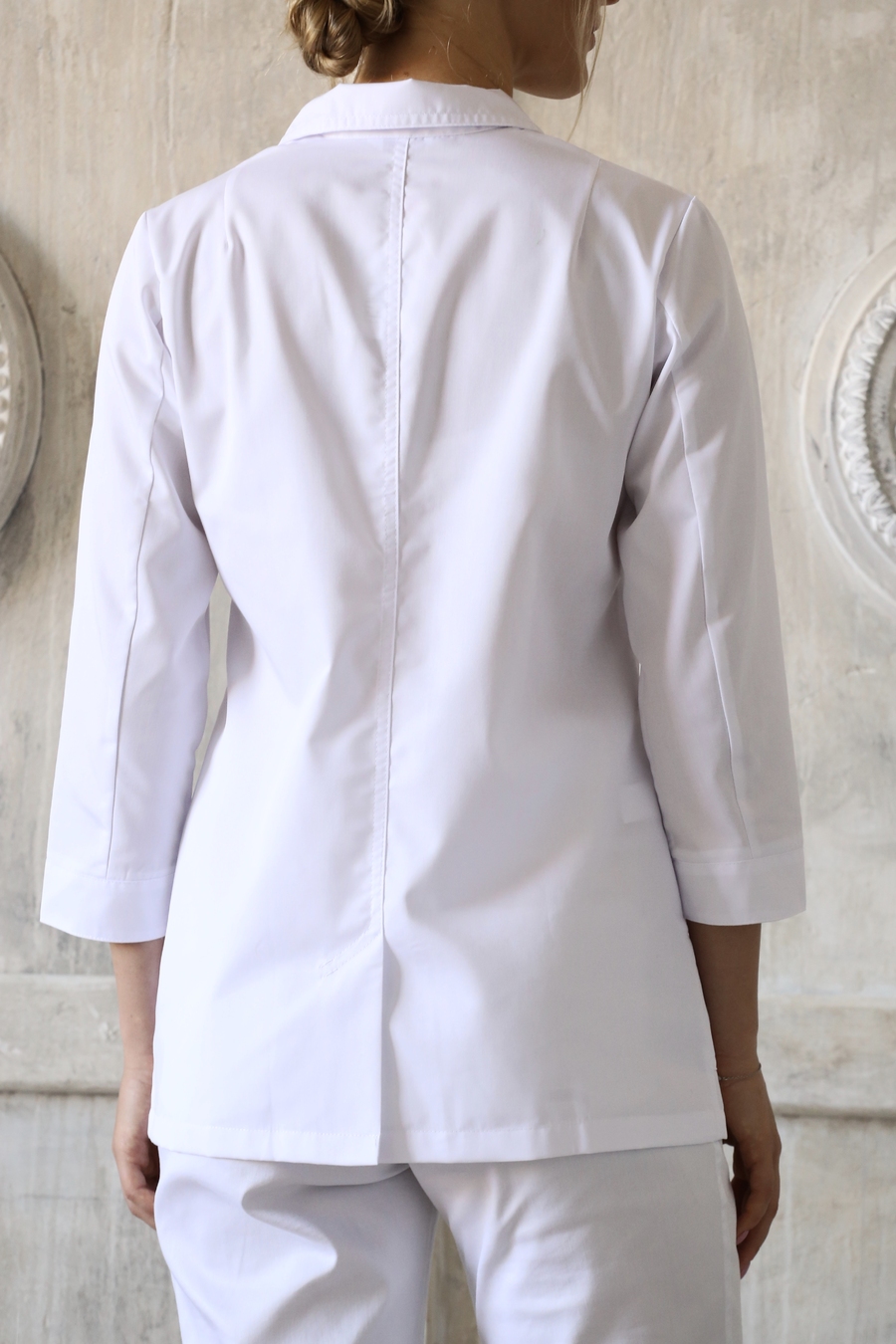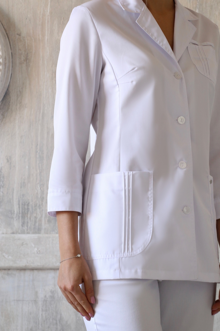 Классическая медицинcкая женская блуза. Рукав 7/8, застежка на пуговицы, отложной воротник с лацканами. Два больших накладных кармана для личных вещей или инструментов и один нагрудный карман. Боковые карманы отделаны декоративной строчкой. Идеально сочетается с брюками «Слим» или брюками на резинке. Размеры: с 42 по 60