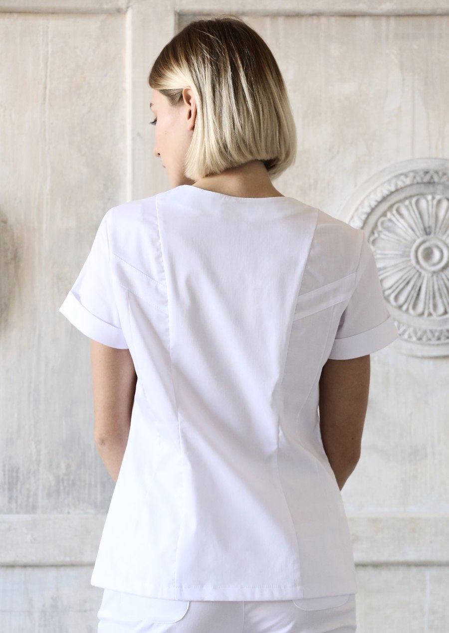 Идеальная женская модель для тех, кто предпочитает одежду без застежек! V-образная горловина, короткий рукав с отворотом и патой сразу привлекут внимание. Предусмотрены четыре кармана - два больших и два дополнительных. В них поместятся и личные вещи, и рабочие инструменты. Блузы от "Доктор Стиль" - всегда элегантны и практичны. Размеры 42-52