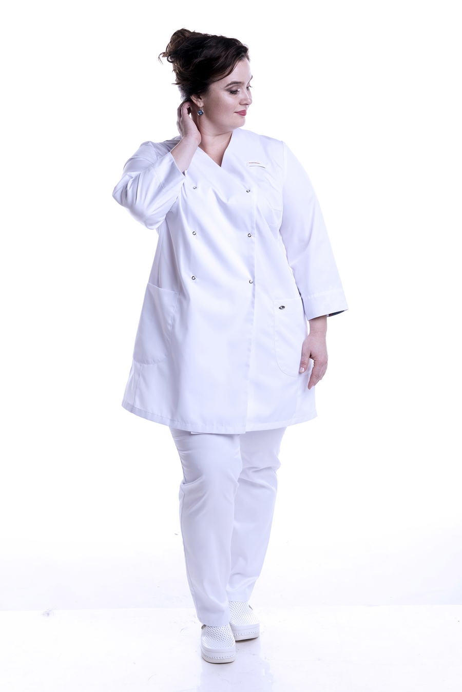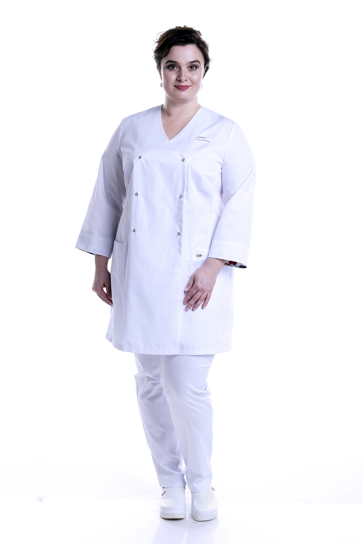 О французской провинции напоминает цветочная отделка на рукавах и кармане этой очаровательной блузы. Удлиненная модель с двубортной застежкой и рукавом 3/4 делают эту женскую блузу чрезвычайно привлекательной и популярной среди медицинских работников. А оригинальный крой с элегантной складкой сзади придаст дополнительный комфорт в повседневной носке. Два накладных кармана , шлевка для бейджа помогут упорядочить рабочий процесс. Блуза отлично сочетается с белыми или другими брюками. Размеры: с 50 по 60