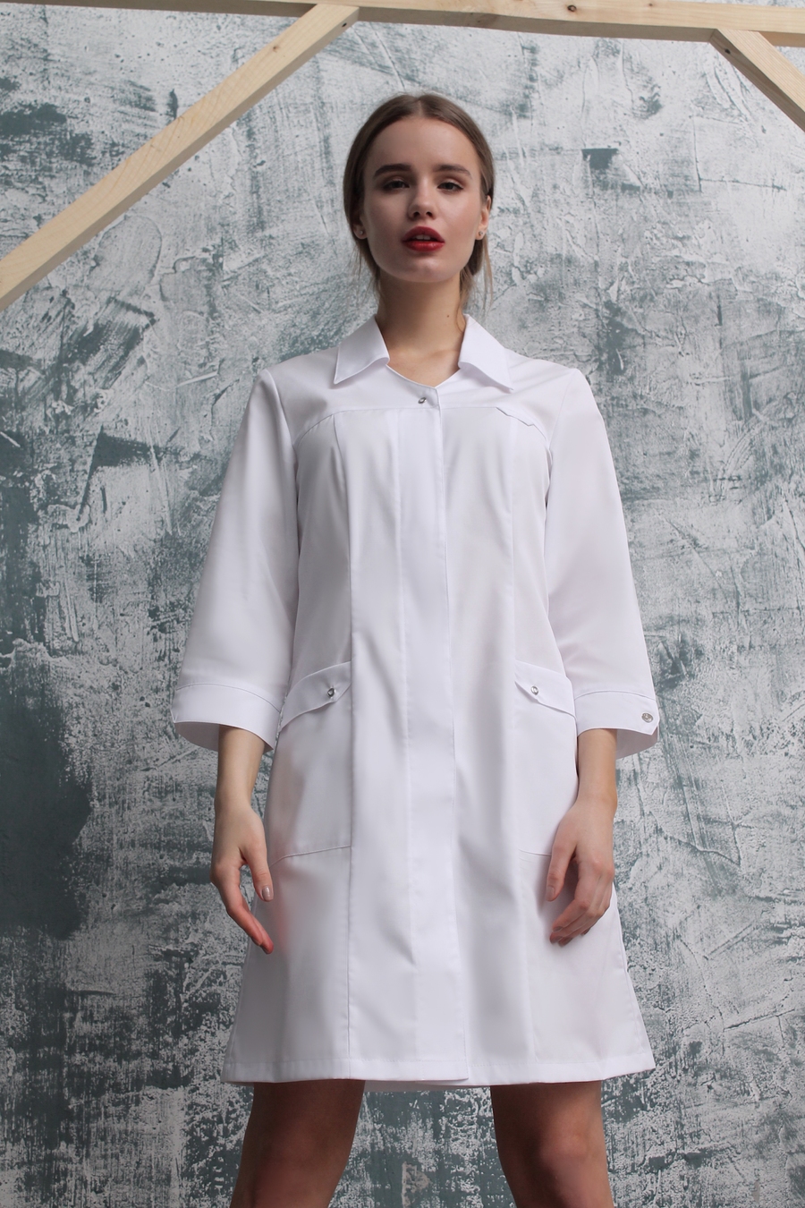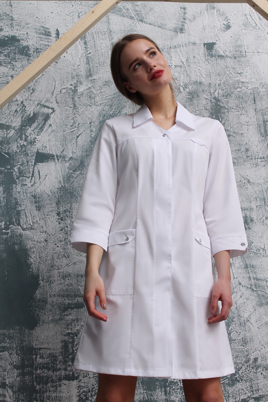 Очаровательная укороченная модель женского халата - это то, что вы давно искали! "Изюминка" этого халата - большой отложной воротник, закругленные разрезы на рукавах и застежка карманов на кнопки. Закрытую застежку вверху дополняет одна кнопка, сочетающаяся с кнопками на карманах. Рукав 3/4 немного расширяется книзу, поэтому вы не будете затруднены в движениях в течение рабочего дня. "Доктор Стиль" - это всегда достойный выбор! Размеры: с 40 по 64.