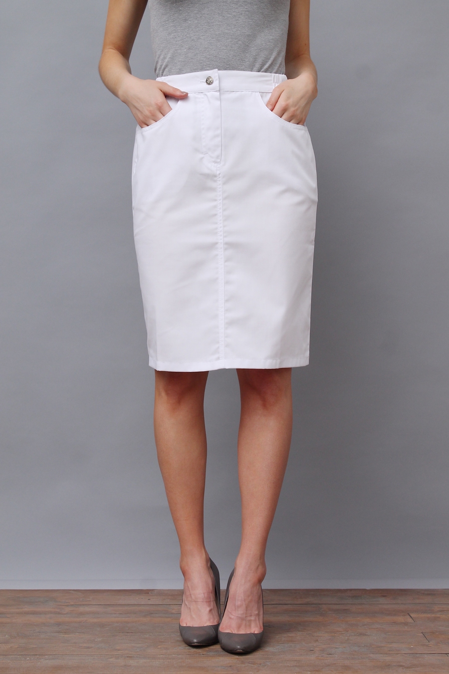 Классическая юбка с застежкой спереди на молнию и кнопку. Юбка из стрейчевой ткани сделана так, чтобы быть удобной для активных движений в течение целого рабочего дня. Юбка имеет эластичный пояс и шлицу сзади в среднем шве. Задний карман украшен логотипом "Доктор Стиль". Часто медицинскую юбку выбирают для администраторов и службы ресепшен. "Доктор Стиль" всегда предлагает лучшее! Размеры: с 40 по 52