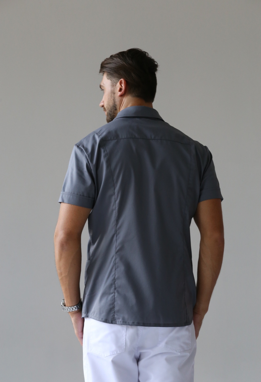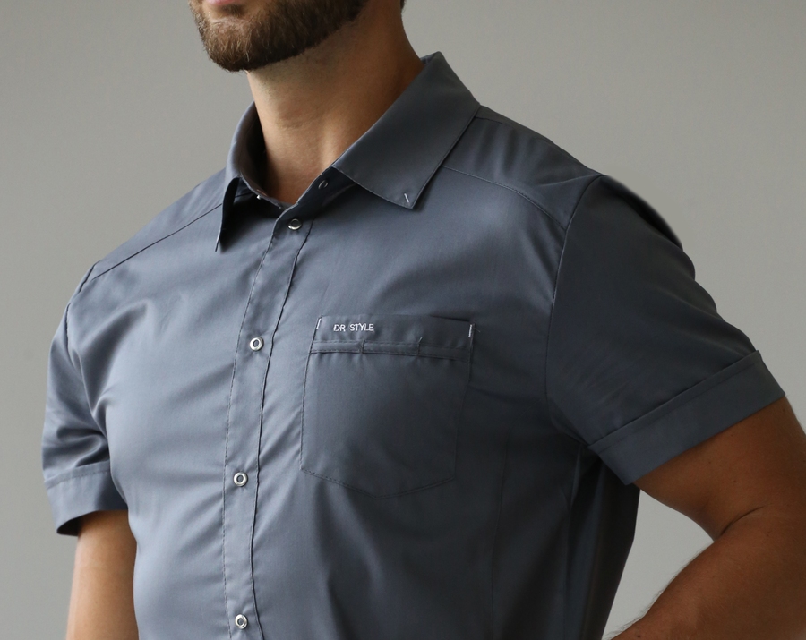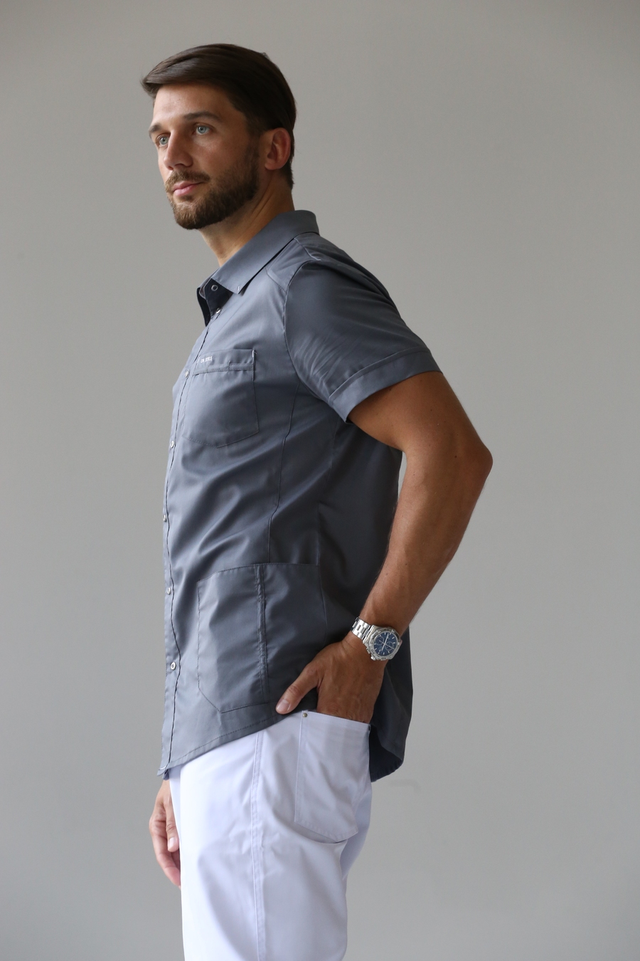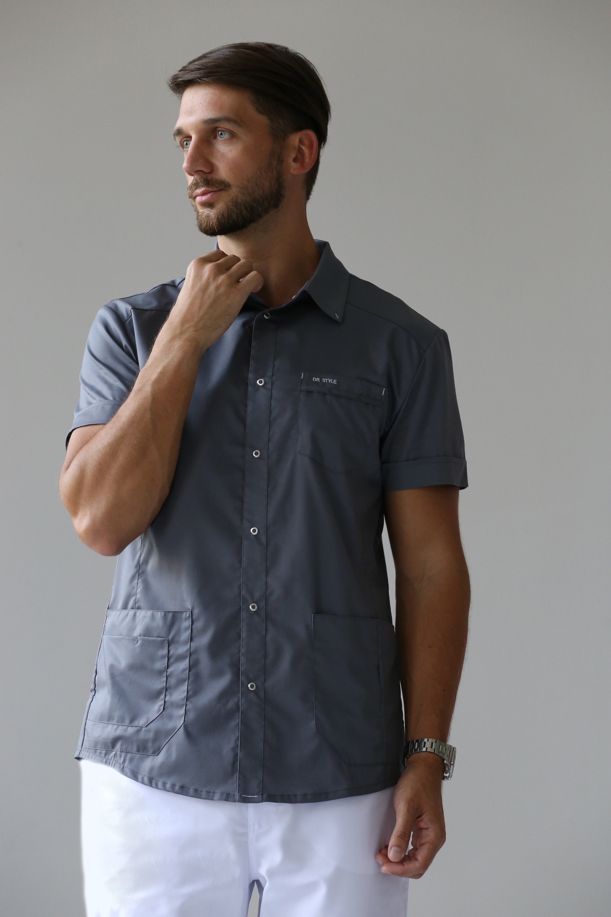 Мужская медицинская блуза ТМ "Доктор Стиль" с коротким рукавом и застежками на кнопки по всей длине чрезвычайно комфортна для ежедневной длительной носки. Три боковых и один нагрудный карман отлично подойдут для рабочих принадлежностей и личных вещей.