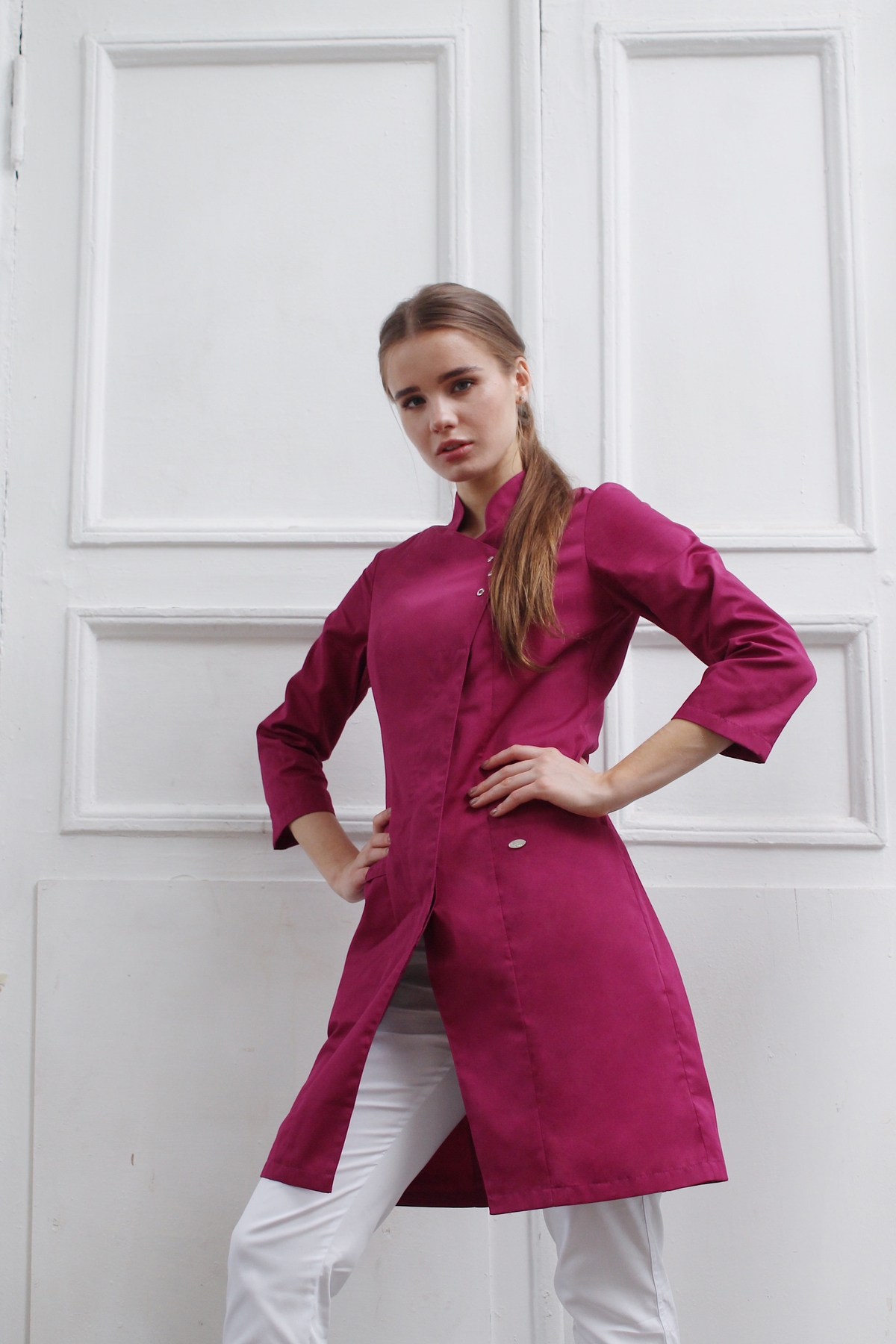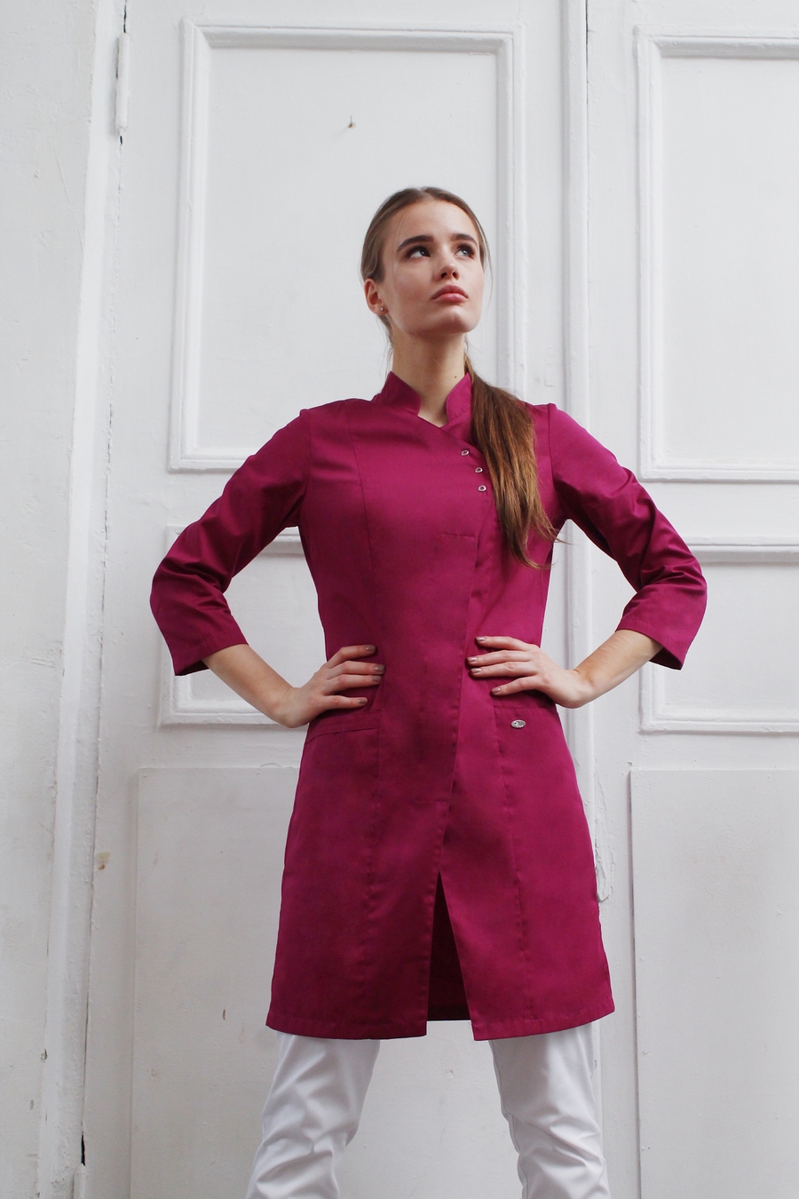Особенность этой модели - комбинированная застежка на кнопки и пуговицы. Блуза удлиненная, с асимметричной застежкой, подчеркнет Ваш силуэт. Воротник-стойка и рукав 3/4 дают комфорт при движении. Два больших боковых кармана могут быть использованы для личных вещей или инструментов. Восточный стиль в сочетании с лавандовым цветом придает медицинскому работнику спокойствие и уверенность. Блуза сочетается с брюками на шнуре или на резинке. Размеры: с 40 по 54